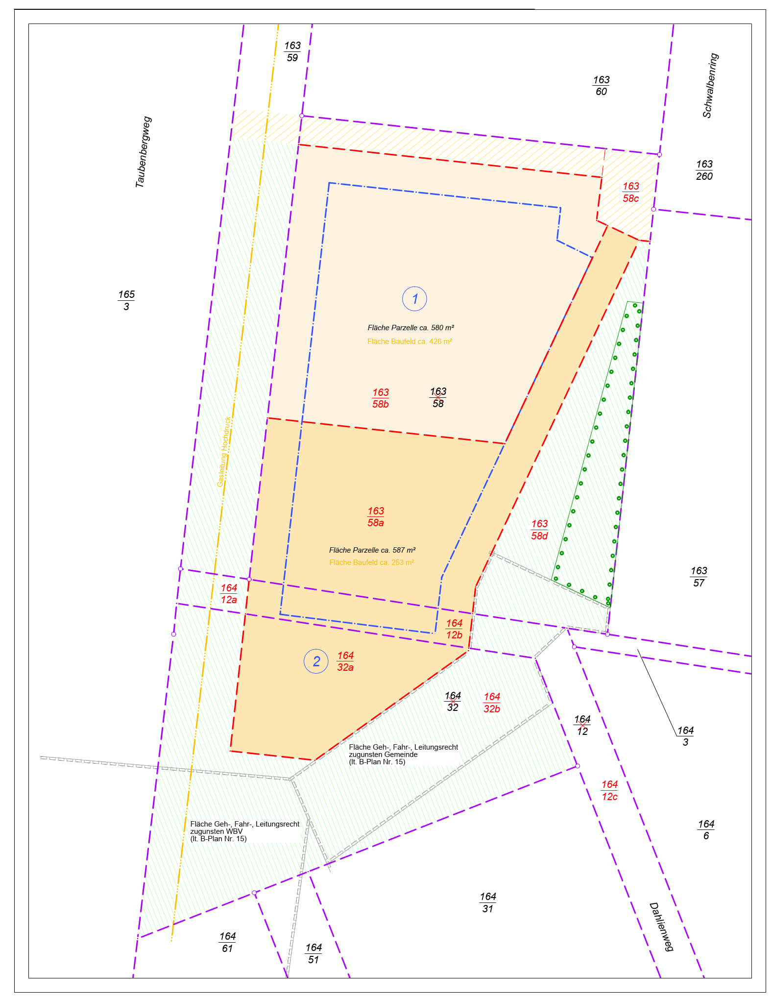Grundstück Nr. 1 in Größe von ca. 580 m² (Flurstück 163/58b gem. Parzellierungsvorschlag im Anhang – Baufeld ca. 426 m²)